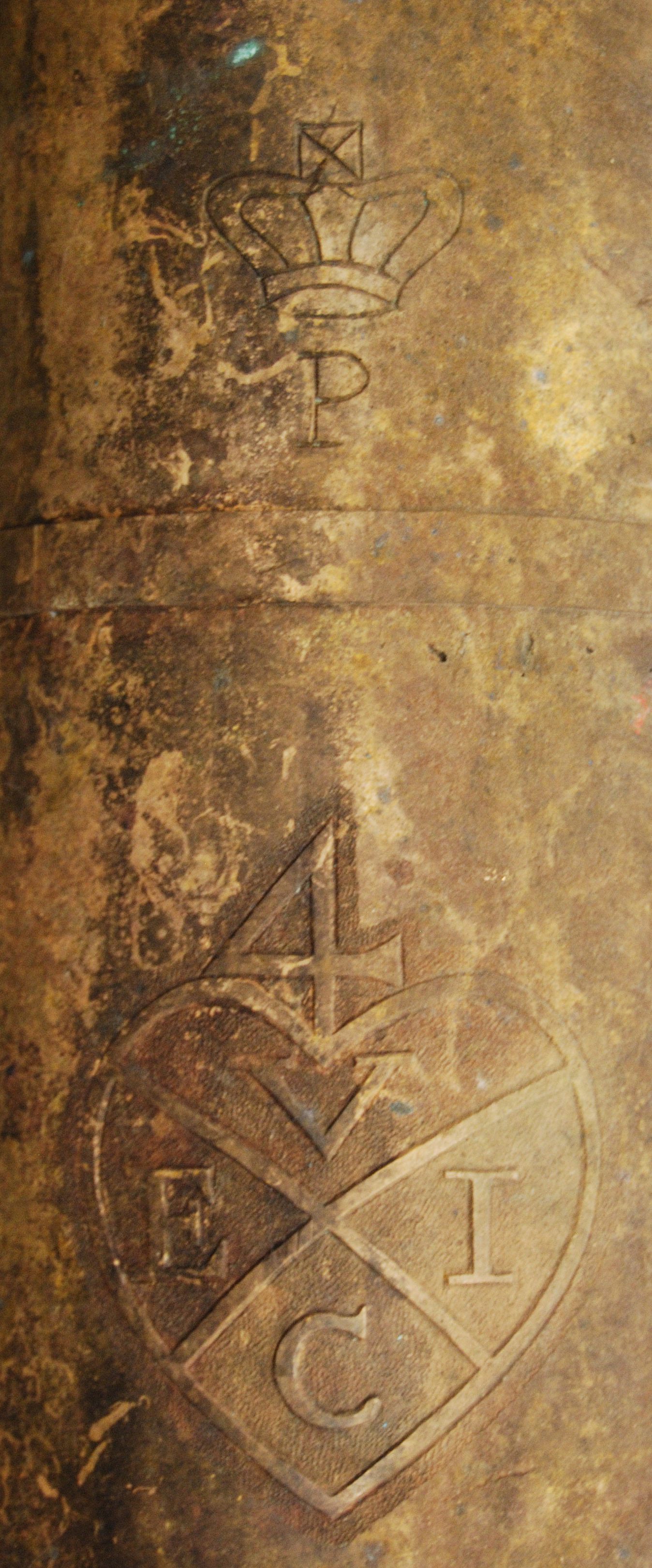 Also cast in, is the heart shaped mark of the United East India Company which was written as VEIC. This merchant mark was used by the company throughout the world on things like seals to goods, guns and small arms. While the company operated in many areas it’s main concern became governing India where it had its own army and ran the administration of the country.
