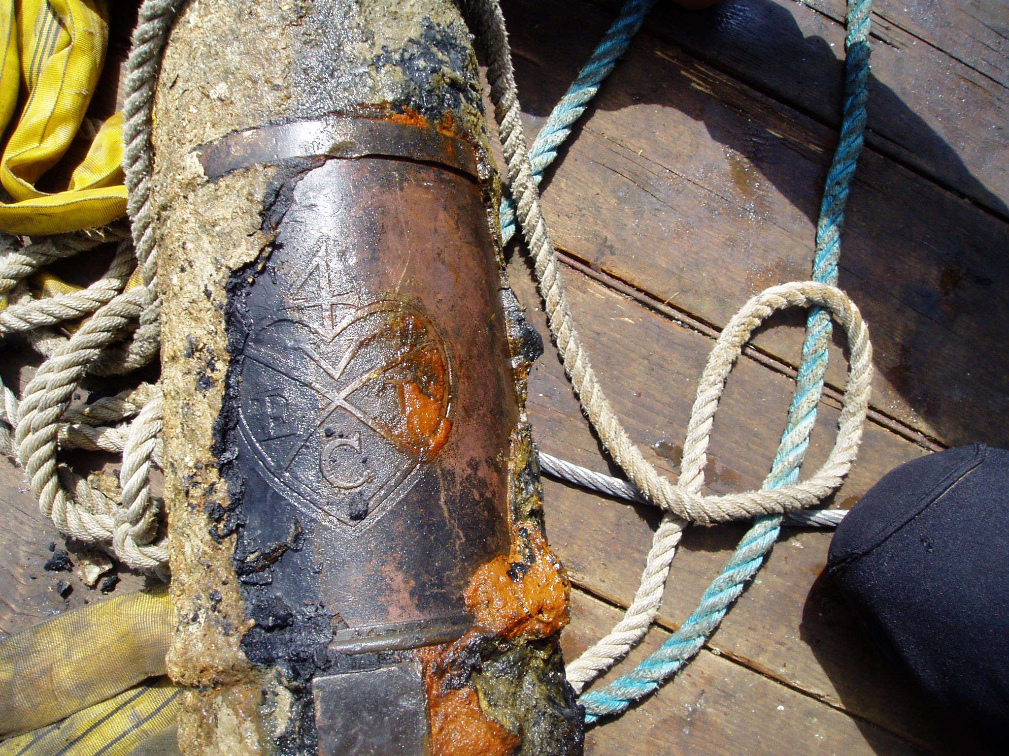 Following recovery, the cannons have been subject to conservation including the removal of encrustation and soaking over several years to reduce chloride levels and ensure their long term stability. The cannons are in exceptionally good condition for items recovered from the sea. They have a number of markings which will help with their identification. Cast into the surface at the base ring is the name William & Graham and the date. This company had a warehouse in the city of London and provided guns for ships and merchant companies to defend themselves from attack.