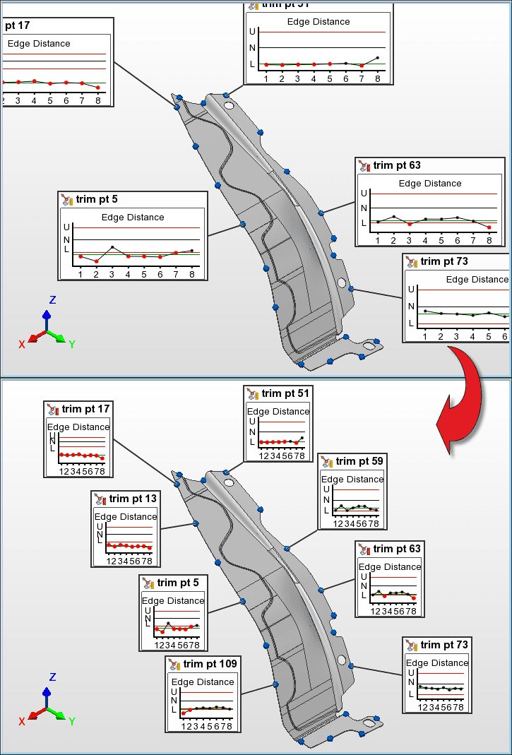 When you inspect a large number of pieces in a project and use trend charts in SPC annotations to view tendencies for many controls, the default width for SPC trend charts can result in a crowded 3D Scene. By resizing the trend charts in SPC annotations, you can easily show more annotations to obtain a better appreciation of the part tendencies.