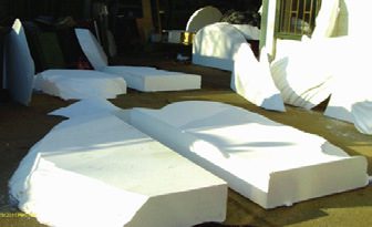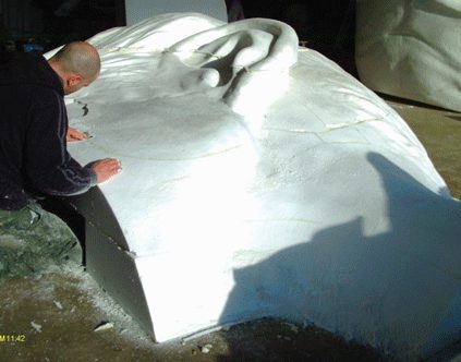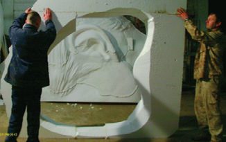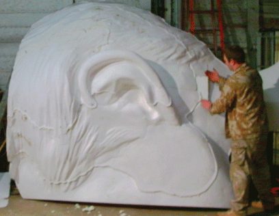 Once cleaned, the model was machined. The machining was carried out by Mark Angus at 3D CNC on a CMS 5 axis Aries machine. The head was made of 23 sections of polystyrene, which all needed to be glued together and carefully trimmed back once it was back at Hero Prop Designs.