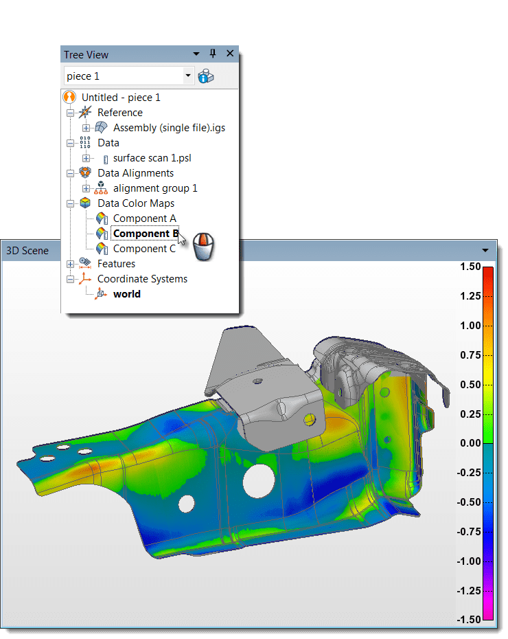 When using several colour maps to analyse your inspection results, toggling between them using menu items is a frequent operation. With PolyWorks® Metrology Suite 2019 IR1, you can simply middle-click over a colour map in the Tree View to change its activation status. With this shortcut, you can quickly trigger the proper colour map for review in the 3D Scene.