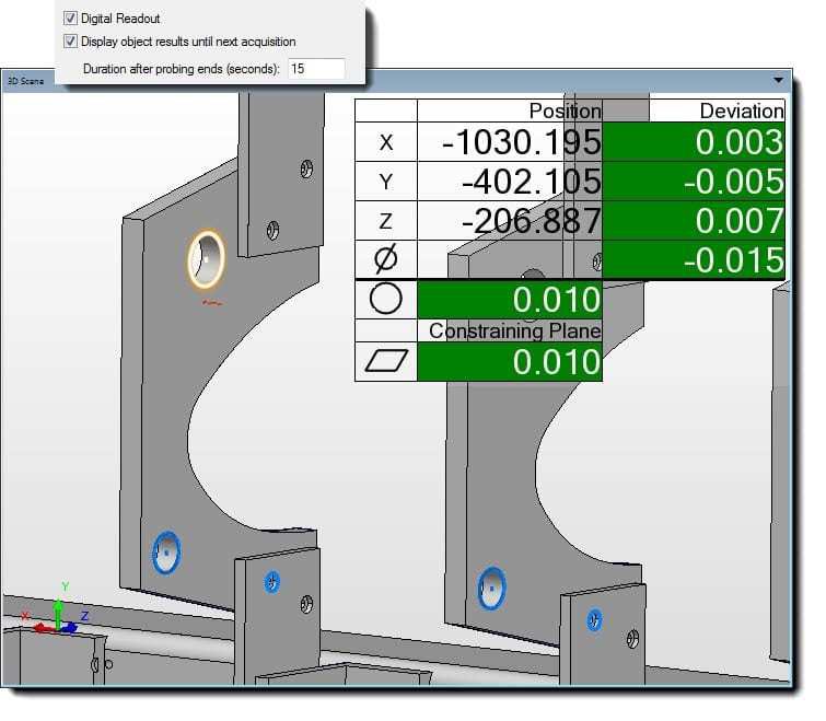 When a feature is measured within a probing session, the information in the DRO for the current object remains until the next acquisition starts. After probing the last feature in the session, the information in the DRO will disappear after the specified period.