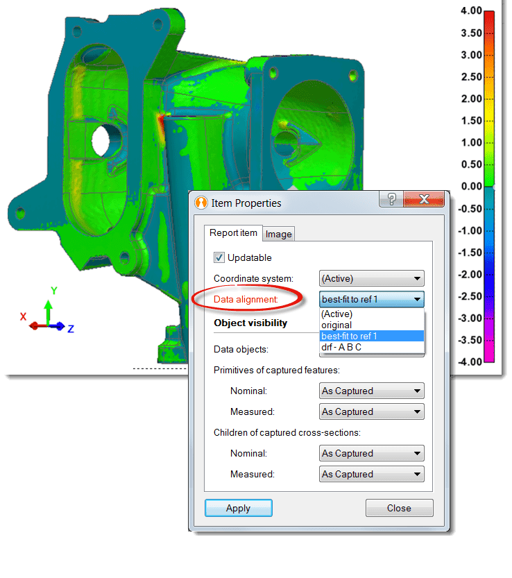 When your objective is to inspect surface deviations in different data alignments, you may want to report the results using a snapshot of the colour map for each individual context. In PolyWorks|Inspector, you can link your snapshot report items to the appropriate data alignment using their property sheet. This added flexibility lets you expand your reporting capabilities and ensures that your measurement results are correctly updated and reported.