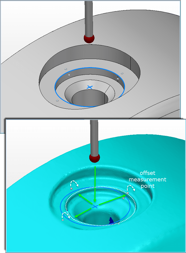 - Then, the CNC probing of the circle is automatically launched. It uses measurement points that have been offset according to the estimated location of the circle and the other parameters specified on the circle’s property sheet.