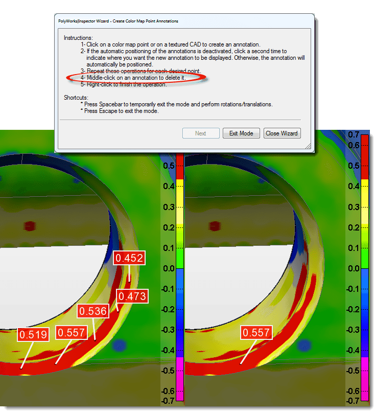 The trick from the wizard can be used when picking colour map annotation points and trying to isolate a local low/high deviation value – you can anchor several annotations and then, without exiting the tool, middle-click to delete all the annotations except the one containing the smallest/largest deviation value.